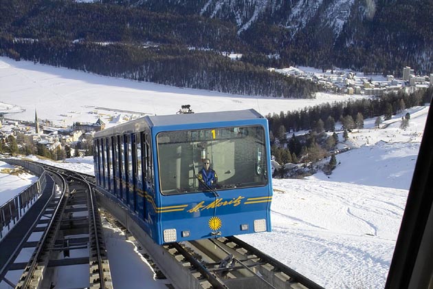 Vue sur St-Moritz pendant le croissement de la funiculaire de Corviglia, le 17 janvier 2005.