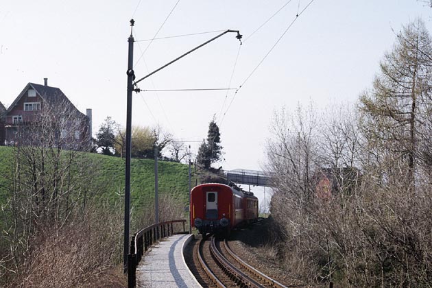 Der Zug nach Rorschach verlässt am 18. April 1987 gerade die Station Wartensee.