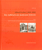 Josef Jung Alfred Escher | 1819 - 1882 Der Aufbruch zur modernen Schweiz 4 Teile im Pappschuber 23,8 x 29,9 x 11,2 cm ISBN 13: 978-3-03823-236-0, ISBN 10: 3-03823-236-X (Gesamtwerk) Teil 1: Leben und Wirken Seiten 1-348 (nummeriert 4-345), 190 Abbildungen s/w, ein- und vierfarbig (davon 9 Bahn+Bus), Pappband, 23,6 x 28,5 cm Teil 2: Nordostbahn und schweizerische Eisenbahnpolitik | Gotthardprojekt Seiten 349-724 (nummeriert 352-723), 210 Abbildungen s/w, ein- und vierfarbig, Pappband, 23,6 x 28,5 cm Teil 3: Schweizerische Kreditanstalt| Eidgenössisches Polytechnikum | Aussenpolitik Seiten 725-980 (nummeriert 728-977), 119 Abbildungen s/w, ein- und vierfarbig (davon 8 Bahn+Bus), Pappband, 23,6 x 28,5 cm Anhang: Seiten 981-1116 (nummeriert 984-1115), kartoniert, 23,6 x 28,5 cm erschienen bei |