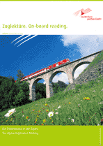 Reto Blatter, Susanne Perren u. a. Zuglektüre. On-board reading. Die Erlebnis-Bahn in den Alpen. / The Alpine-Experience Railway. 52 Seiten / pages, 73 Abbildungen s/w und vierfarbig / illustrations b/w and in four-colour printing, 21 x 29,7 cm deutscher und englischer Text / Text in German and English Broschüre (Klebebindung) / booklet herausgegeben von / published by |