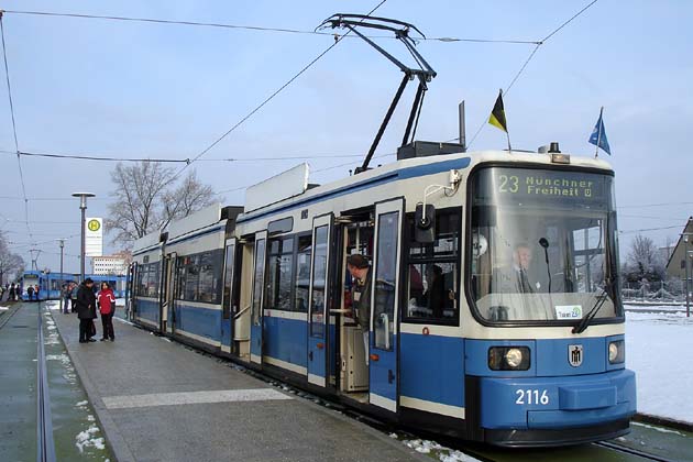 R2.2-Triebwagen 2116 und R3.3-Triebwagen 2217 in der Schleife Schwabing-Nord am 12. Dezember 2009.